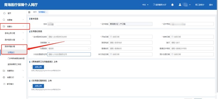 登录“青海医保APP”→“服务”→“医保办理”→“生育登记”,填写生育登记信息,并上传相关材料后提交。