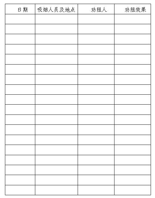 三、园区劝烟工作人员要按照此制度切实开展工作,认真填写劝阻吸烟工作记录表(详见附件),并于每月第四周周五下午将劝阻吸烟工作记录表交至新区创卫办。