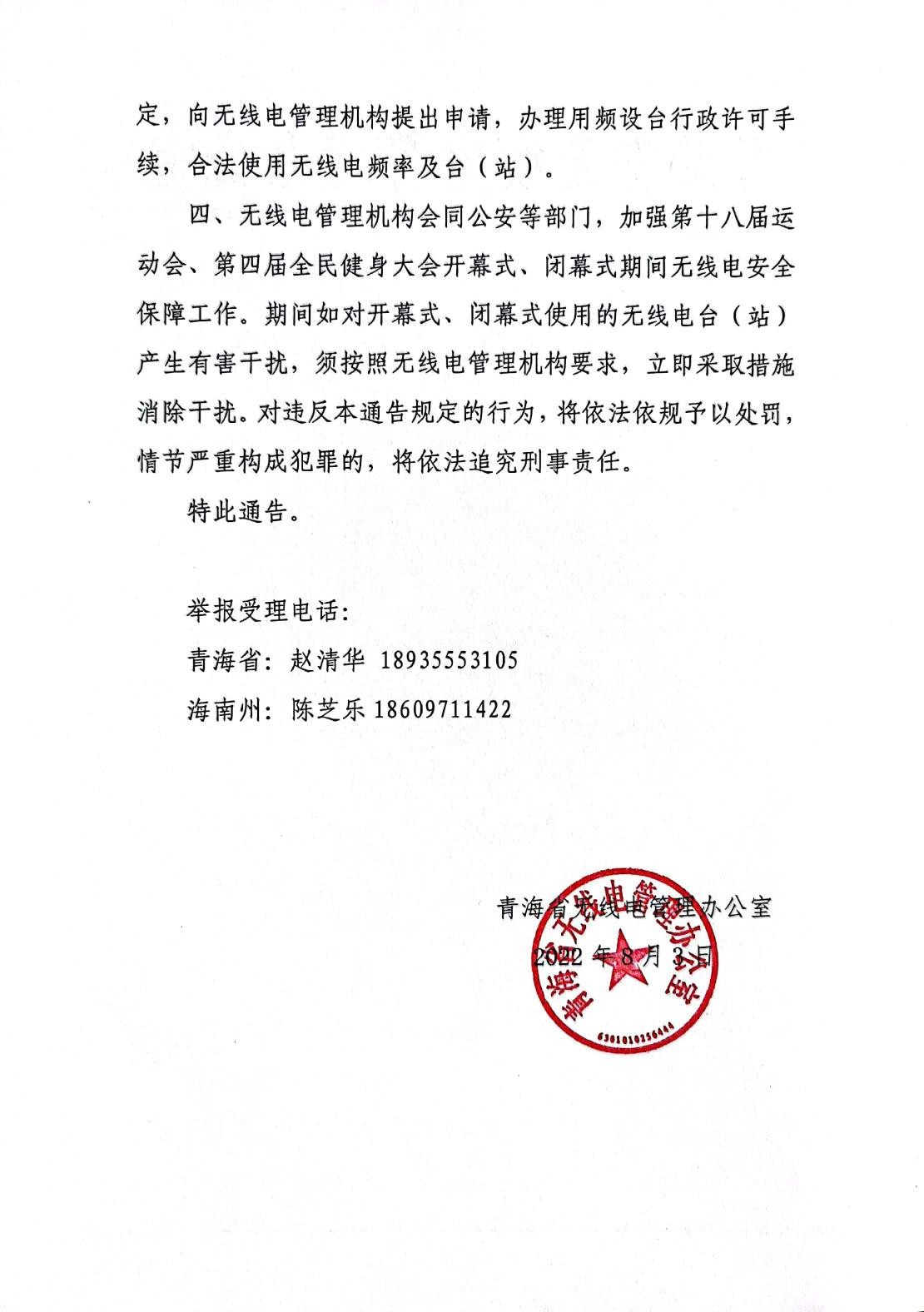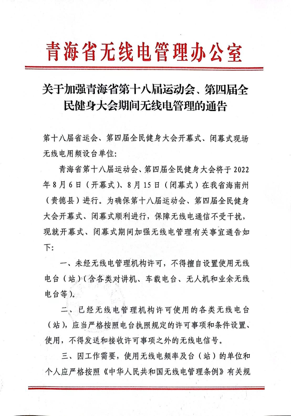 关于加强青海省第十八届运动会、第四届全民健身大会期间无线电管理的通告