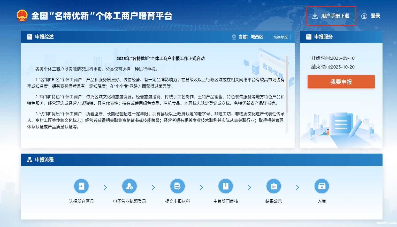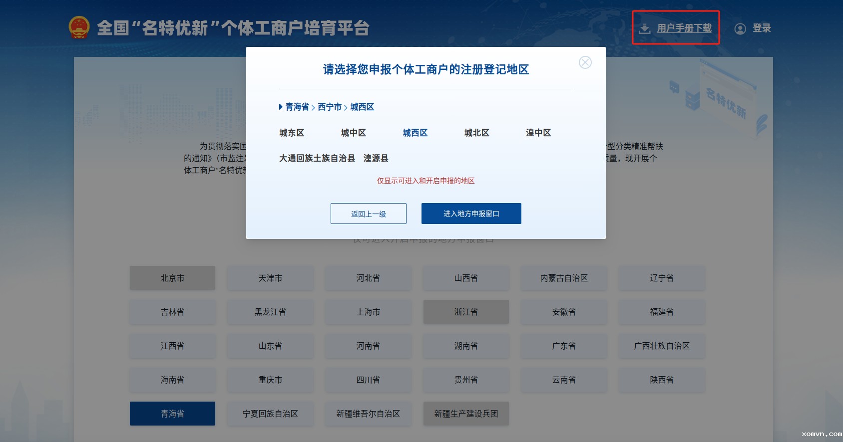 (一)自主申报。①电脑端申报:登录全国“名特优新”个体工商户培育平台(https://mtyx.gtgsh.com)地方申报窗口申报。例如:选择“青海省”-“西宁市”-“城西区”,点击“进入地方申报窗口”,然后在新页面上点击“我要申报”,使用电子营业执照登录即可申报(操作流程见附件2)。网站首页有用户手册可供下载参考以指导申报操作。②手机移动端申报:微信内分享地址链接(网址为https://mtyx.gtgsh.com)或扫描下方二维码(附件3),进入到申报系统首页。点击“我要申报”-“开始申报”,长按并识别登录二维码,进入电子营业执照小程序“下载执照”,进入申报界面。