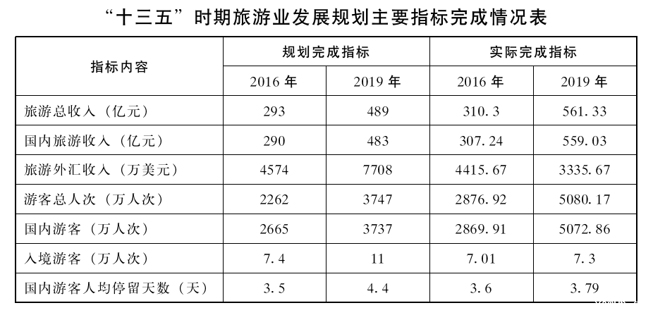 ———旅游业高质量发展。旅游资源有效整合,旅游产品不断创新,打造国际生态旅游目的地成效明显。到2025年,接待游客达到7300万人次,旅游总收入达到800亿元,年均增速20%以上,推出50条生态旅游精品线路,形成15条生态旅游风景道,指导3家景区创建国家5A级旅游景区,指导4家生态旅游区创建国家生态旅游示范区,打造20个文化特色鲜明的国家级、省级旅游休闲街区。
