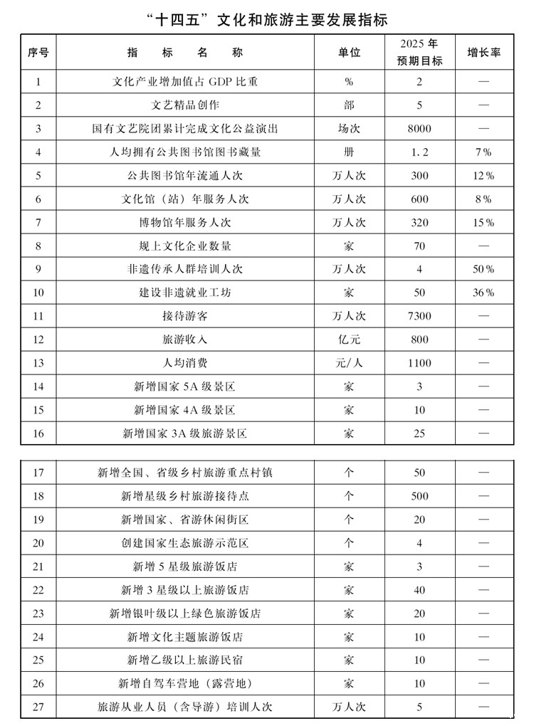 到2025年,全省文化事业、文化产业和旅游业发展水平不断提升,人民群众精神文化生活日益丰富,文化和旅游治理体系和治理能力不断提高,文化铸魂、文化赋能和旅游为民、旅游带动作用日益凸显。