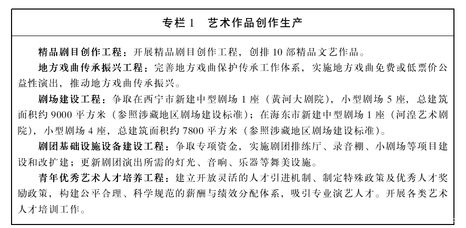 (四)推动国有文艺院团深化改革。深化国有文艺院团改革,出台《青海省关于深化国有文艺院团改革的实施意见》。以演出为中心环节,激发国有文艺院团生机活力,实现院团创演质量、管理水平、服务效能提升。优化剧场供应机制,促进国有文艺院团与剧场深度合作,支持团场合作、以团带场或以场带团。加强对民营文艺表演团体的支持、规范、引领,加快推动民营文艺表演团体高质量发展。实施国有文艺院团排练厅、录音棚、小剧场等基础设施建设,对灯光、音响等舞美设施设备更新换代,不断满足剧团新时代发展需要。