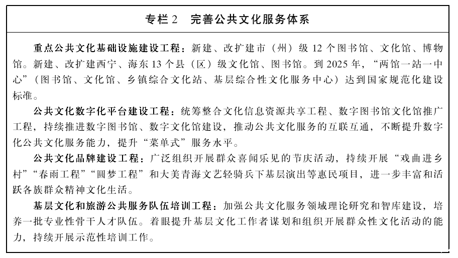 ———公共服务效能持续提升。扎实推进省、市(州)、县、乡镇(街道)、村(社区)五级现代公共文化服务体系、县级文化馆图书馆总分馆制建设、公共文化机构法人治理结构改革,成功创建西宁、格尔木、互助国家级公共文化服务体系示范区(项目)。组建博物馆、文化馆、图书馆联盟,全省52个图书馆、55个文化馆服务到馆群众1000万人次,举办各类群众文化活动3万场次,线上线下参与人数3400余万人次。省图书馆(二期)、省文化馆新馆投入使用,村级综合性文化服务中心建设实现全覆盖,为500个村级综合性文化服务中心配备管理员。组建100支大美青海文艺轻骑兵,下基层演出3000余场次;实施文化进村入户、戏曲进乡村等文化惠民工程,服务群众400万人次;招募志愿者231名,深入乡村学校少年宫开展“阳光工程”“圆梦工程”等文化艺术普及志愿服务;举办全省群众文艺调演、西北五省(区)花儿演唱会等系列群众文化活动,丰富了基层群众文化生活。