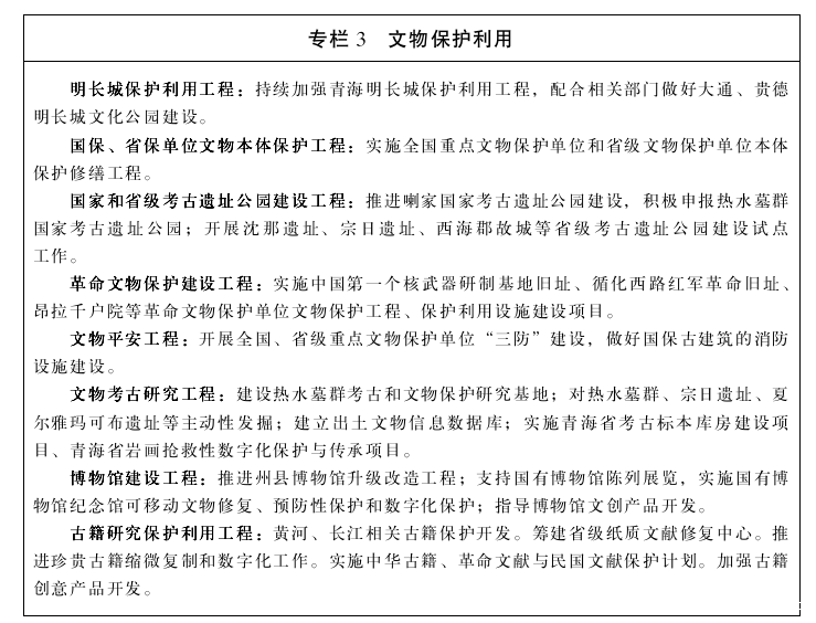 ———文物保护利用全面推进。出台《关于进一步加强文物工作的实施意见》《关于加强文物保护利用改革的实施方案》等,全省文物抢救性保护和预防性保护取得阶段性成效。积极推进“考古前置”,实施考古调查、勘探、发掘项目30余项。完成第一次可移动文物普查,全省革命文物和石窟寺调查工作,公布我省第一批革命文物名录。全省现有不可移动文物6411处,可移动文物312793件,全国重点文物保护单位51处、省级466处,国家级历史文化名城1个、名镇1个、名村5个、传统村落123家。热水墓群考古和文物保护研究基地建设、喇家国家考古遗址公园建设和明长城保护管理工作积极推进,第一个核武器研制基地旧址、昂拉千户院保护利用工作扎实开展。喇家遗址、热水墓群考古发掘入选“百年百大考古发现”,乌兰泉沟吐蕃时期壁画墓入选“全国十大考古新发现”,都兰热水2018血渭一号墓入选“考古中国”重大项目。“山宗水源路之冲—一带一路中的青海”“江河源人类史前文明展”获全国博物馆十大陈列展览精品推介活动优胜奖,《唐蕃古道—七省区精品文物联展》入选国家文物局重点展览项目,《多元华彩·融合创新—青海民族民间艺术展》入选“弘扬优秀传统文化、培育社会主义核心价值观”主题展览推介项目。