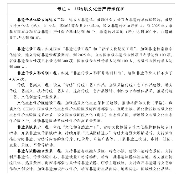 ———非遗保护传承卓有成效。颁布《青海省非物质文化遗产条例》,出台《关于推进中华优秀传统文化传承发展工程的实施意见》《关于加强文化生态保护实验区建设的指导意见》《“青绣”提升三年行动计划(2021—2023年)》《青海省省级文化生态保护区管理办法》。国家级热贡文化生态保护区,国家级藏族文化(玉树)、格萨尔文化(果洛)生态保护实验区,省级海西德都蒙古族、互助土族、循化撒拉族文化生态保护实验区建设稳步推进,区域性整体保护更加有效。实施《中国传统工艺振兴计划》,土族盘绣等11个项目入选首批国家传统工艺振兴目录。完成50项国家级省级非遗传承人及项目“非遗影像记录工程”,形成200部数字文献资料。设立18家国家级、省级非遗扶贫就业工坊,建成328家非遗传习基地(中心、所)。成立青海省刺绣行业协会,30万绣娘用老手艺绣出了新生活。全省现有各级非遗代表性项目2361项,代表性传承人3108名,各级传承人参加各类展演活动千余场次,线上线下参与人数达到3000万人次。