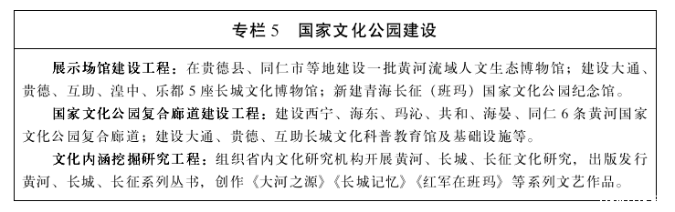 (三)长征国家文化公园(青海省)建设。以班玛县全国爱国主义教育示范基地红军沟纪念馆、红军标语、红军墓等红色遗址遗迹为核心,依托丰富的生态旅游资源,建设长征国家文化公园青海班玛纪念馆,传承长征精神。