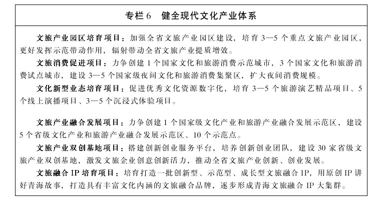 (二)推动文化产业结构优化升级。实施文化品牌战略,打造一批有影响力、代表性的文化品牌。依托青海特色文化资源,开发具有鲜明区域特点和民族特色的数字文化产品。提高创意设计发展水平,促进创意设计与实体经济、现代生产生活、消费需求对接,扶持一批以文化创意为核心,依托数字技术进行创作、生产、传播和服务的数字文化产业项目。培育3—5个旅游演艺精品项目、5个线上演播项目、3—5个沉浸式体验项目。推进文化与信息、工业、农业、体育、健康等产业融合发展,提高相关产业的文化内涵和附加值。推动上网服务、歌舞娱乐、游艺娱乐等行业全面转型升级,引导发展新业态、新模式,提升服务质量,拓展服务人群。