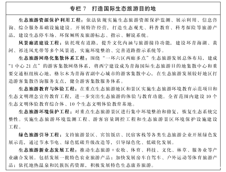 (四)推进生态旅游实验区和风景道建设。依据资源禀赋,建成青海湖、塔尔寺、祁连阿咪东索、茶卡盐湖、金银滩—原子城、贵德清清黄河等国际生态旅游目的地省级实验区。在国家公园、自然公园、自然保护区等区域依法依规开展国际生态旅游景区试点建设工作。以国、省道、铁路沿线为基础,黄河风情、唐蕃古道和“丝绸之路”青海道为依托,打造生态旅游风景道。加强风景道沿线生态资源保护,完善游憩服务设施,优化交通管理服务,实现从单一交通功能向交通、美学、游憩和保护等复合功能转变。