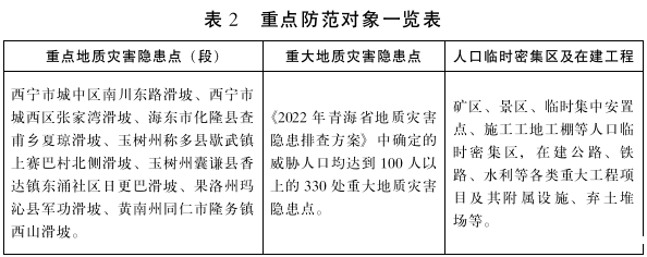 (三)重点防范对象。受地质灾害威胁的重点地质灾害隐患点(段)、《2022年青海省地质灾害隐患排查方案》中确定的330处重大地质灾害隐患点、人口临时密集区及在建工程。