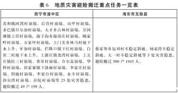 (四)开展避险搬迁,消除灾害隐患。各地要在充分尊重群众意愿的前提下,深入推进地质灾害避险搬迁工作。落实好2022年省级财政安排的西宁市湟中区49户199人和海东市互助县500户1945人的避险搬迁任务。
